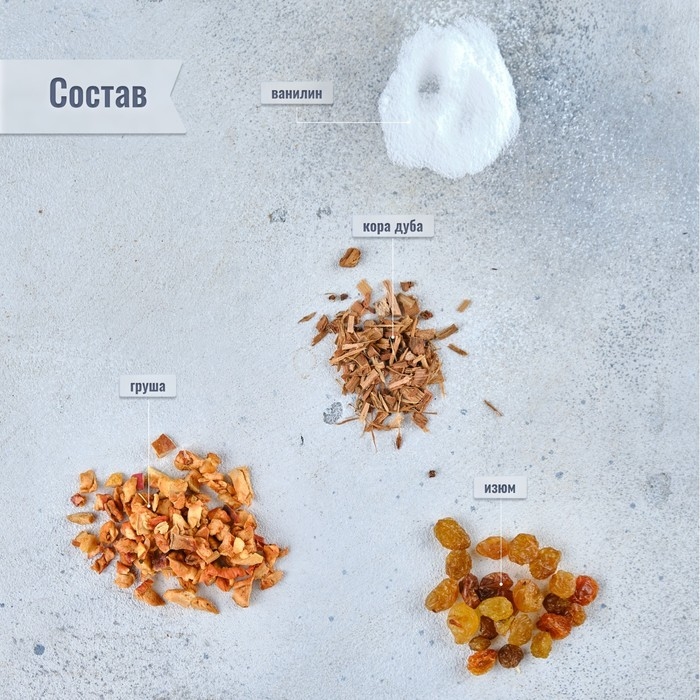 Состав: груша сушеная, изюм, кора дуба, ванилин.