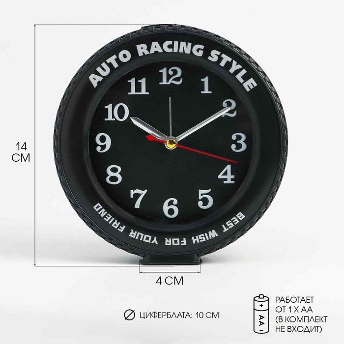 Часы с будильником представлены в ярком дизайне в форме автомобильного колеса, они отлично впишутся в ваш интерьер. Интерьерные часы станут прекрасным декором для дома и дачи, их можно поставить как на прикроватную тумбочку в спальне, детской комнате, гостиной так и на стол или на комод в зале, холле или на кухне. Будильник настольный имеет кварцевый механизм, который гарантирует высокую точность хода. Часы настольные обладают громким будильником, ребенку и вам будет комфортно просыпаться, на работу и в школу. Будильник на батарейках не требует частой замены батареек благодаря экономичному механизму.
