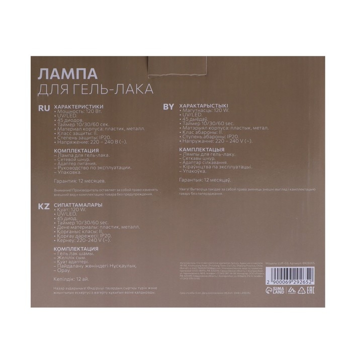 Лампа для гель-лака Luazon LUF-03, UV/LED, 120 Вт, 45 диодов, таймер 10/30/60, 220 В, белая