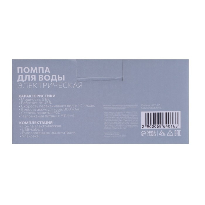 Помпа для воды Luazon LWP-07, электрическая, 5 Вт, 1.2 л/мин, 800 мАч, АКБ