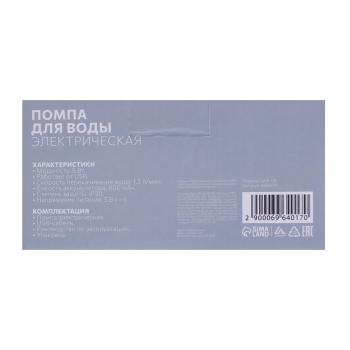 Помпа для воды Luazon LWP-07, электрическая, 5 Вт, 1.2 л/мин, 800 мАч, АКБ