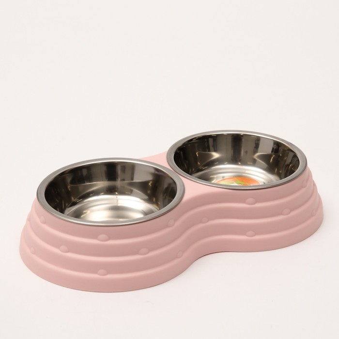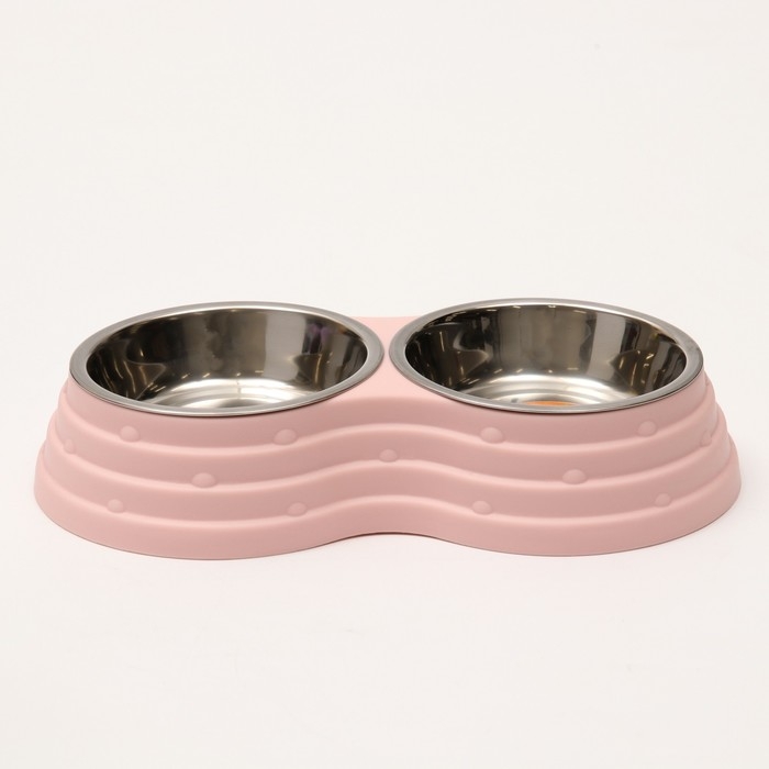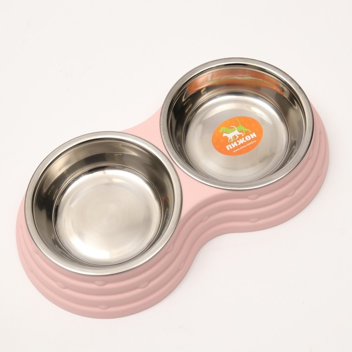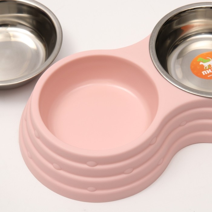 Миска металлическая двойная на пластиковом основании 2 х 160 мл, 25 х 14 х 5 см, розовая