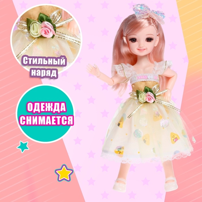 - Платье и туфельки снимаются. Ребёнок сможет сам придумать для куколки новые наряды и одеть по своему желанию.
