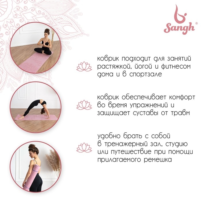 Коврик для йоги Sangh «Будда», 183х61х0,6 см, цвет пастельный розовый