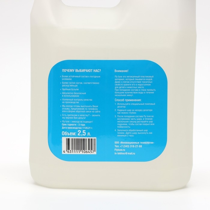 Способ применения: используйте специальный помповый дозатор. Наденьте шар на насадку дозатора как можно глубже. После попадания состава во внутреннюю часть шара, в течение нескольких секунд растирайте шар ладонями, чтобы состав покрыл всю поверхность. Заполните обработанный шар гелием. Дайте шару высохнуть как минимум 2 часа.