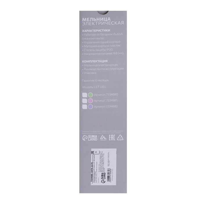Мельница электрическая Luazon LET- 003, пластик, от батареек, зеленая