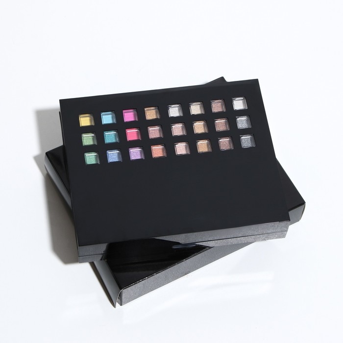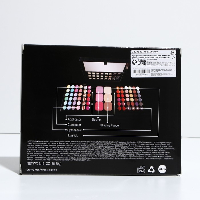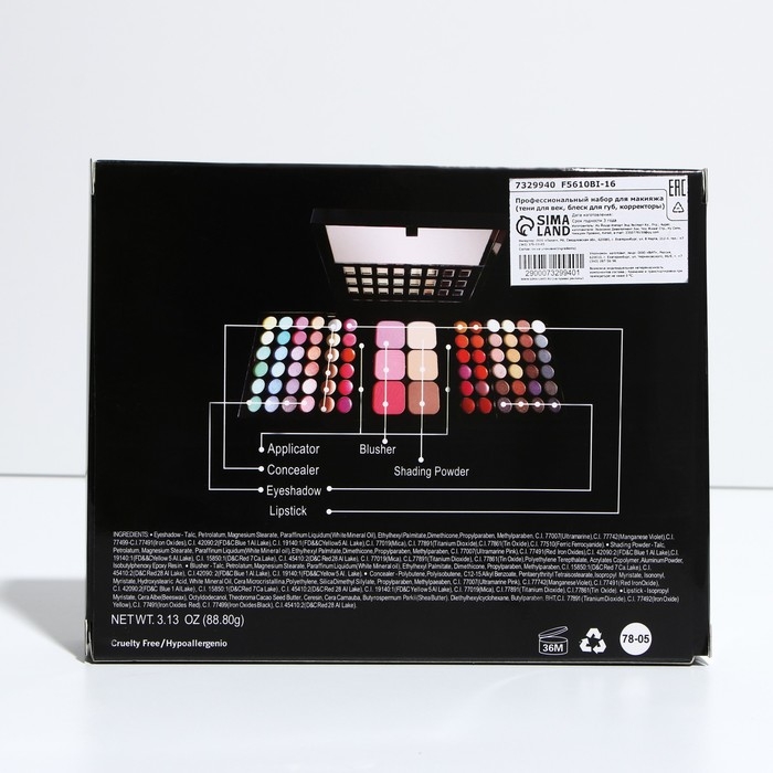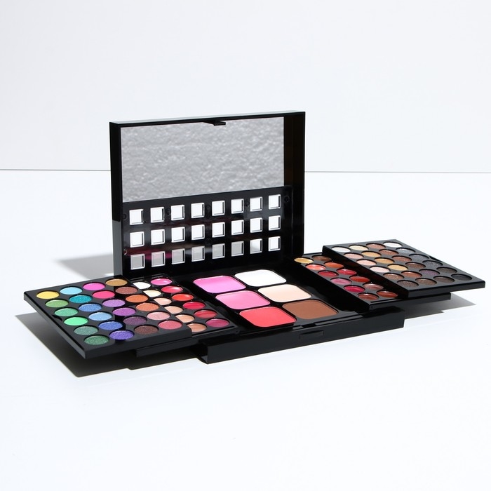 Бьюти-кейс с высококачественной профессиональной косметикой: 48 оттенков теней, 24 блеска для губ, 3 румяна, 3 корректора, большое удобное зеркало и 8 аппликаторов в комплекте.
