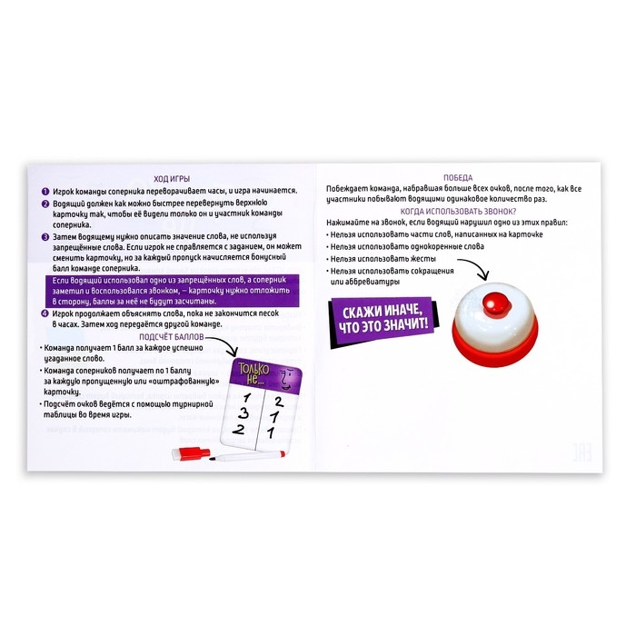 - Водящий одной из команд будет объяснять слова. А водящий другой команды — переворачивать песочные часы и следить, чтобы соперники не использовали запрещённых слов. Если это всё-таки произошло, участники команды-противника нажимают звонок.