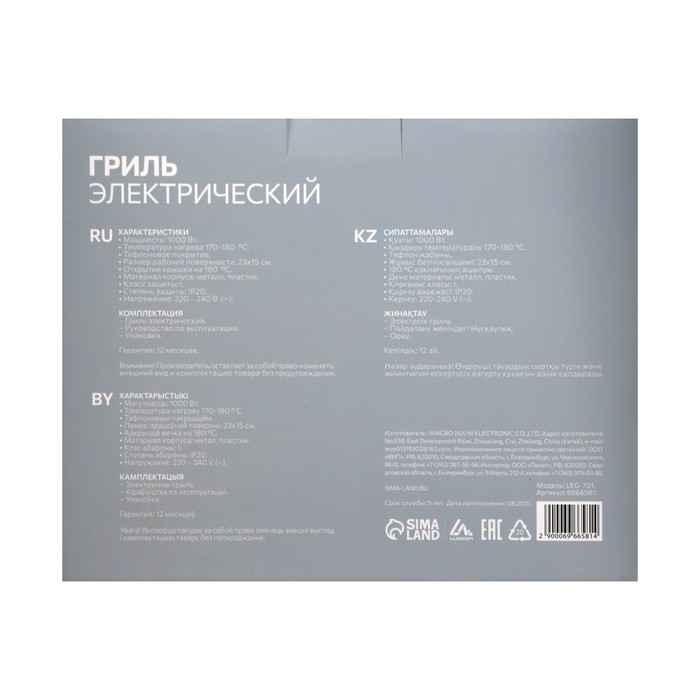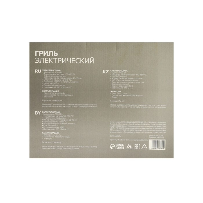 Электрогриль Luazon LEG-701, 1000 Вт, антипригарное покрытие, 23х15 см