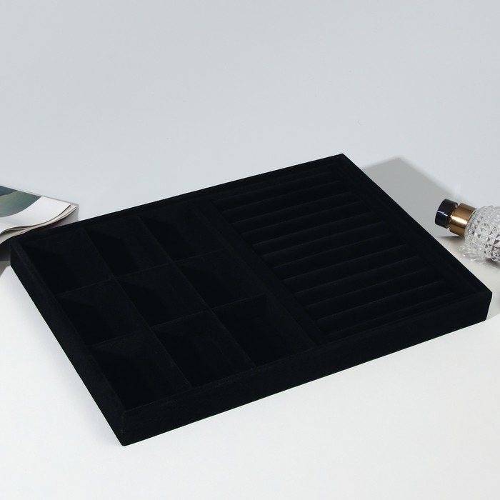 Подставка для украшений 9 ячеек и 11 полос для колец, флок, 35×24×3 см, цвет чёрный