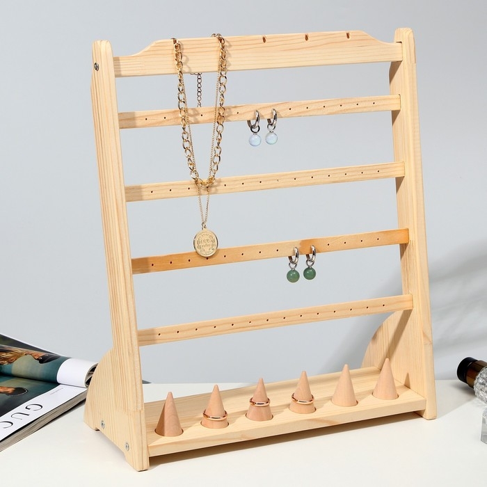 Подставка для украшений 32×12,5×37, 4 ряда по 7 пар серёг, 6 колец, 5 кулонов, цвет бежевый