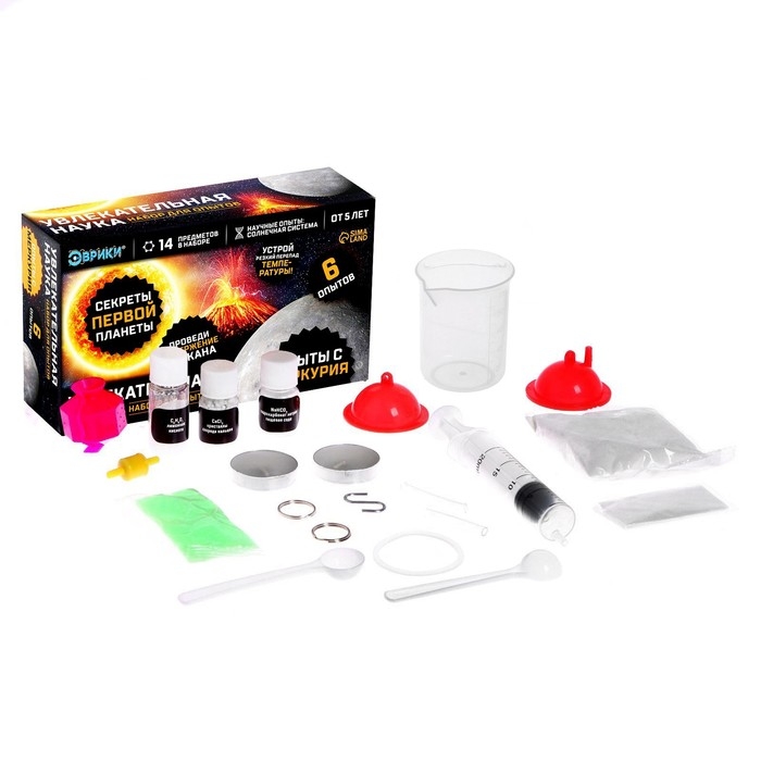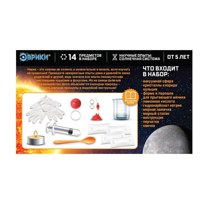 С набором для опытов «Эврики» ребёнок узнает об удивительных свойствах веществ, проведёт несколько интересных экспериментов, связанных с особенностями одной из планет Солнечной системы.
