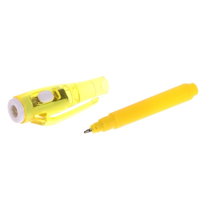 У волшебной ручки есть ещё одна функция — невидимые чернила. Снимите колпачок и напишите что-нибудь на листе бумаги, а затем посветите на надпись фонариком. Рисунок проявится.
