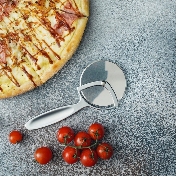 Нож для пиццы — универсальный кухонный инструмент, который не только легко разрезает готовую выпечку, но и помогает поделить на слайсы липкое тесто. Нож имеет эргономичную форму ручки и острое круглое лезвие. Колесо, прикреплённое к рукояти, продавливает продукт, а не разрезает его в отличие от классического ножа. Благодаря такому способу тесто разрезается, а начинка остается на месте.