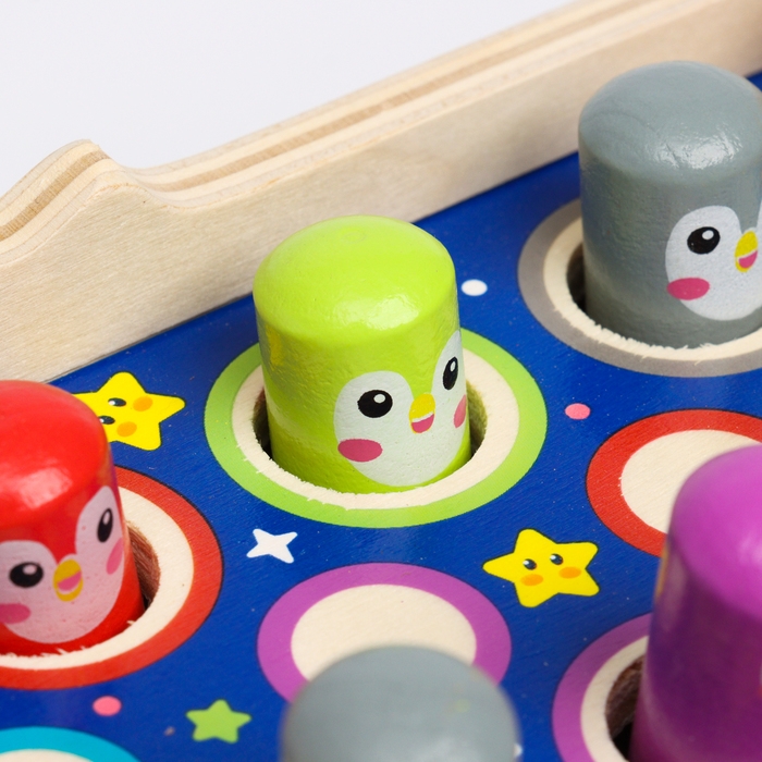 У логического центра несколько поверхностей с разными играми. Есть стучалка, магнитная рыбалка с весёлыми червячками и шестерёнки.