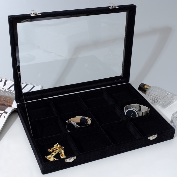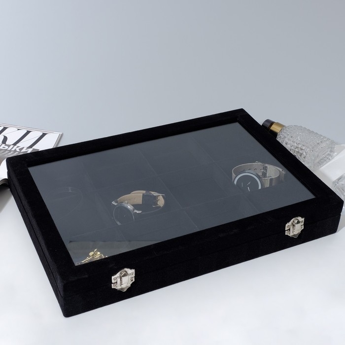 Подставка для украшений «Шкатулка» 12 ячеек, стеклянная крышка, 35×24×4,5 см, цвет чёрный