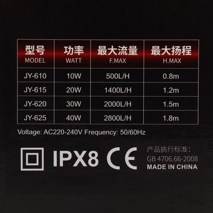Помпа аквариумная JINGYE JY-610, 500 л/ч, 10 Вт, высота подъема воды 0,8 м