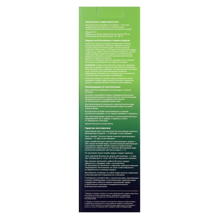 Фильтр-бутылка "Аквафор", очистка от хлора, примесей, сменная насадка, зеленая