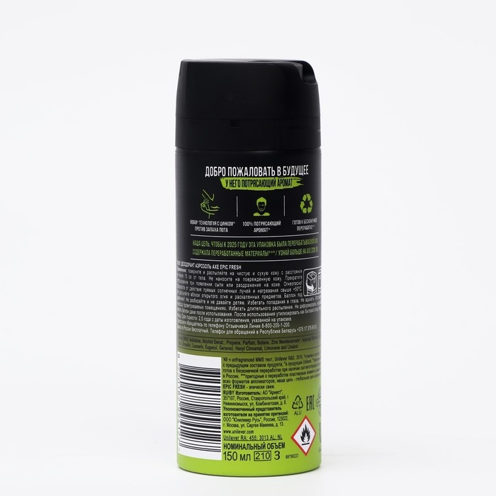 Описание: оцени крутую новинку от ""AXE"" – дезодорант-аэрозоль ""Epic Fresh"". Твоя уверенность и удовольствие при каждом использовании! 100% топовый аромат, как всегда, разработанный в сотрудняичестве с одняим из лучших парфюмерных домов, на этот раз раскрывается мощными акватическими аккордами в сочетании с эпичной свежестью сочного грейпфрута и нотками пряного кардамона. Современный смелый фужерный аромат, и самая долгая свежесть от ""AXE""! В основе формулы – антибактериальная технология ""ZINC ZAP"", – твоя усиленная неприятного запаха на основе цинка. Она препятствует появлению неприятного запаха, при этом не содержит солей алюминия и позволяет коже дышать. Забудь про следы на одежде и неприятный запах. Только ощущение свежести, и крутой современный аромат, который привлечет к тебе еще больше нужного внимания. Каждый аромат ""AXE"" – это парфюмерный шедевр, созданный при участии лучших парфюмерных домов мира. Упаковка в актуальном дизайне займет достойное месяцевто на твоей полке.