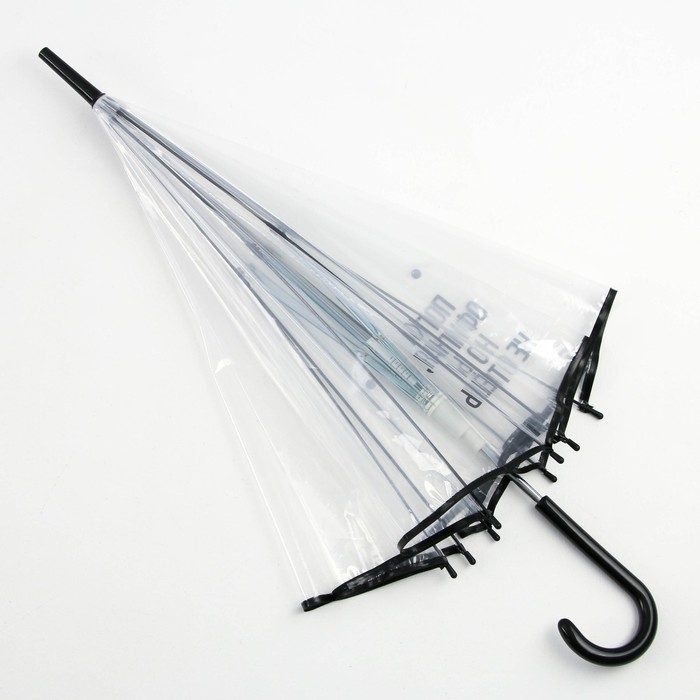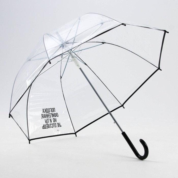 Прозрачный зонт-купол с металлическими спицами и пластиковой ручкой. Полуавтоматический механизм. Преимущество прозрачного зонта в том, что он не загораживает обзор, при этом надёжно защищая от дождя.