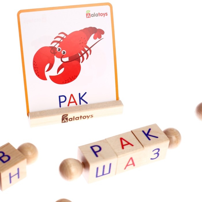 Разложите в ряд несколько карточек стороной изображениями без названий. Попросите ребёнка подобрать к ним слова, составив их из кубиков. Если ребёнку это пока трудно, переверните карточки. Так ребёнок будет видеть целое слово и составлять его из букв.