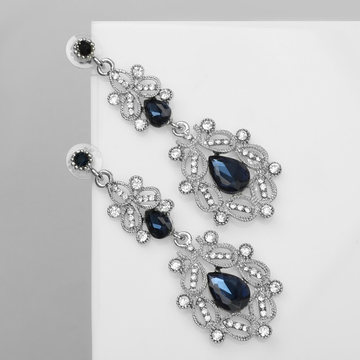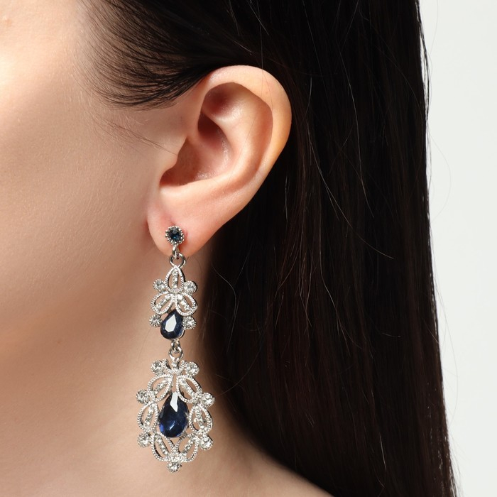 Серьги висячие со стразами «Грация» резная, цвет синий в серебре, 9 см
