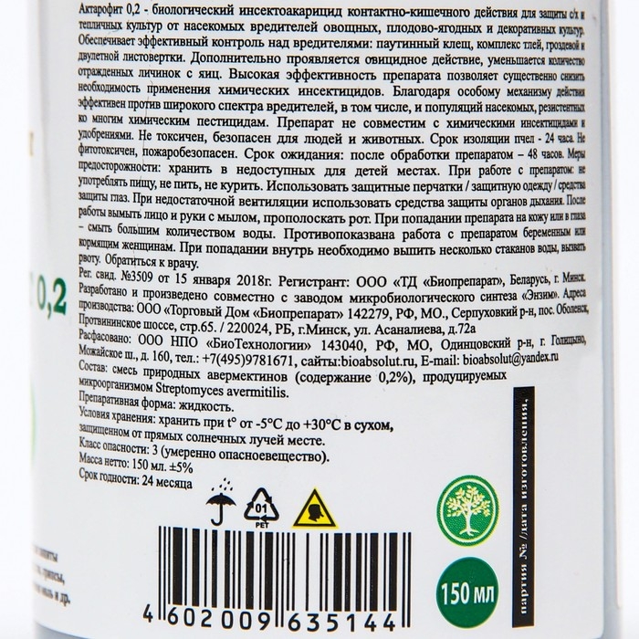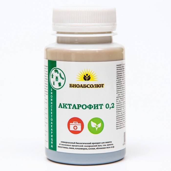 Актарофит 0,2 - биологический инсектоакарицид контактно-кишечного действия для защиты с/х и тепличных культур от насекомых вредителей овощных, плодово-ягодных и декоративных культур. Обеспечивает эффективный контроль над вредителями: паутинный клещ, комплекс тлей, гроздевой и двулетной листовертки. Дополнительно проявляется овицидное действие, уменьшается количество отражденных личинок с яиц. Высокая эффективность препарата позволяет существенно снизить необходимость применения химических инсектицидов. Благодаря особому механизму действия эффективен против широкого спектра вредителей, в том числе, и популяций насекомых, резистентных ко многим химическим пестицидам.