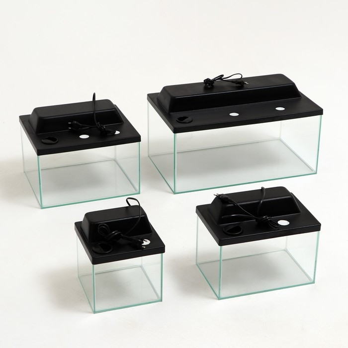 Комплект террариумов выполнен из высококачественного стекла, благодаря евро кромке имеет высокую защиту от трещин, сколов, что повышает степень безопасности при эксплуатации. Крышка надежно защищает от пыли, оснащена патроном под лампу Е14, светодиодной лампой Е14 на 7 ватт и еще двумя патронами под лампу Е14. Компактные размеры террариума позволяют разместить его в любом удобном месте, что делает его более доступным и удобным для использования и ухода. Любимец будет обеспечен кусочком суши и комфортными условиями для существования. Указан номинальный объём террариума.