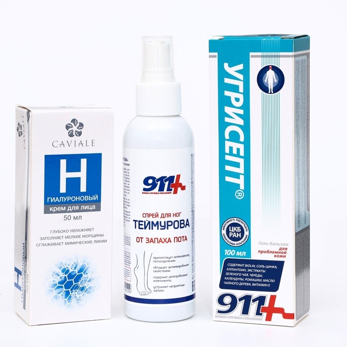 Набор, спрей для ног "Теймурова", 150 мл, гель для лица "911" "Угрисепт", 100 мл, крем для лица "Caviale", гиалуроновый, 50 мл
