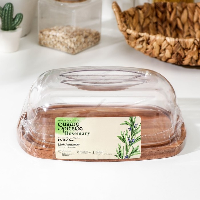 Контейнер предназначен для хранения продуктов в холодильнике и для подачи готовых блюд на стол: ассорти сыров, бутербродов для завтрака, закусок. Основание контейнера изготовлен из дерева бук. Деревянная поверхность покрыта минеральным маслом, что снижает риск проникновения запахов внутри древесины и продлевает срок службы. Пластиковая прозрачная крышка надёжно закрывает контейнер благодаря глубоким желобам, что позволяет сохранить первоначальную свежесть продуктов и защитить его от посторонних запахов. Чтобы контейнер сохранял свои качества, его не рекомендуется мыть в посудомоечной машине, а также нельзя греть в микроволновой печи и замачивать на длительное время в воде. Изделие необходимо мыть тёплой водой с мыльным раствором. После мытья тщательно просушить. Каждые 2-3 месяца, доску рекомендуется обрабатывать маслом