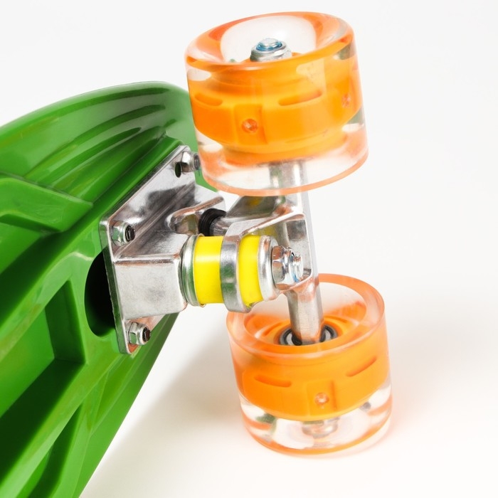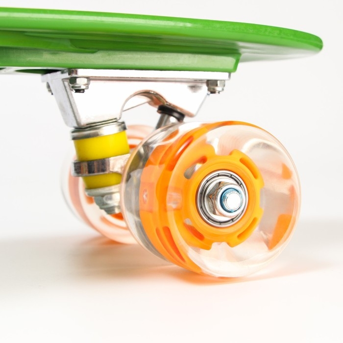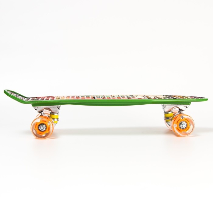 Детский скейтборд со светящимися колесами и красочным принтом покорит любого ребенка своим дизайном, а родителей продуманной до мелочей конструкцией и ее безопасностью!. Дека пенниборда сделана из прочного пластика, его преимущество заключается в том, что со временем он не деформируется в отличие от деревянных скейтбордов. Дека имеет антискользящее ребристое покрытие для безопасности вашего ребенка, а светящиеся колеса обезопасят катание в темное время суток. Маневренная подвеска упрощает контроль за управлением движения круизера и смягчает неровности. За счёт больших, мягких и широких колёс перемещение по улицам становится приятным и скоростным.