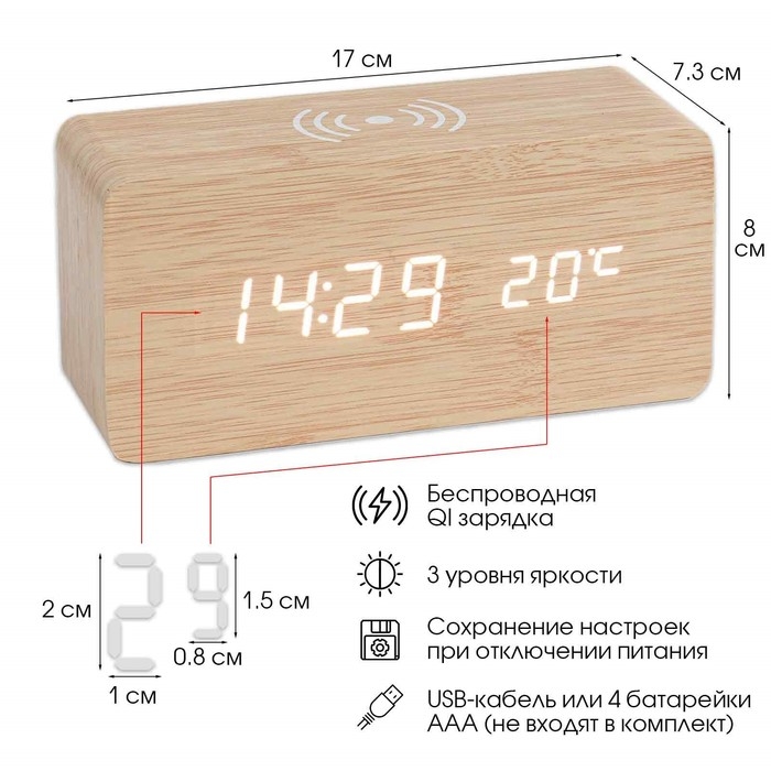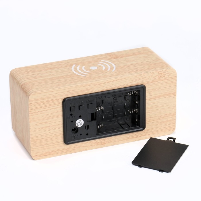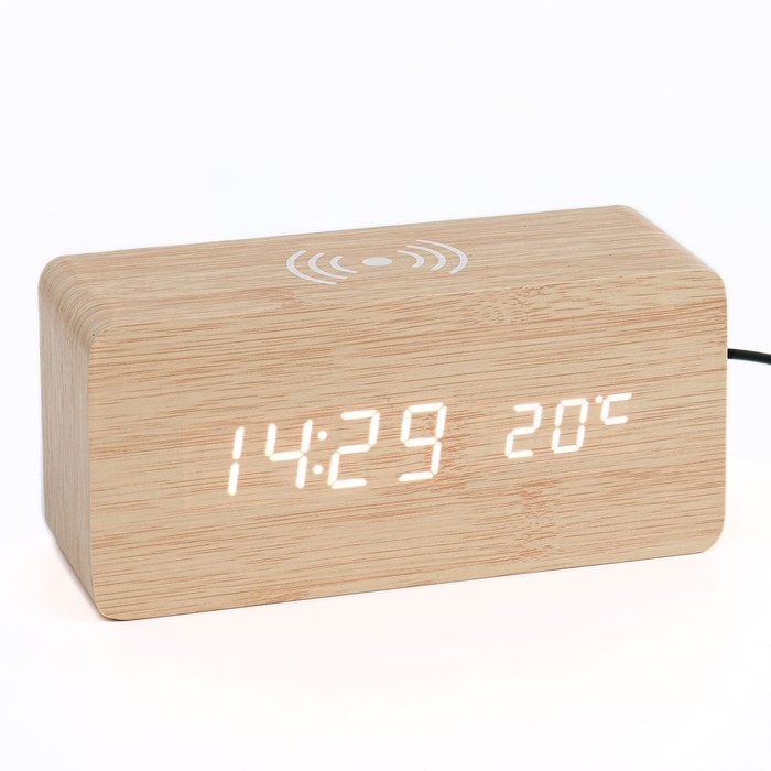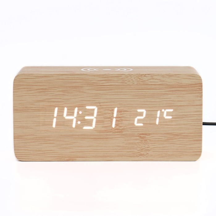 Часы настольные электронные из МДФ с будильником, тремометром и с возможностью беспроводной зарядки телефона и другой электроники представлены в современном дизайне с имитацией натурального дерева. Интерьерные часы станут прекрасным декором для дома и дачи, их можно поставить как на прикроватную тумбочку в спальне, детской комнате, гостиной так и на стол или на комод в зале, холле или на кухне. Часы настольные обладают громким будильником, ребенку и вам будет комфортно просыпаться, на работу и в школу. Будильник не требует частой замены батареек благодаря экономичному механизму.