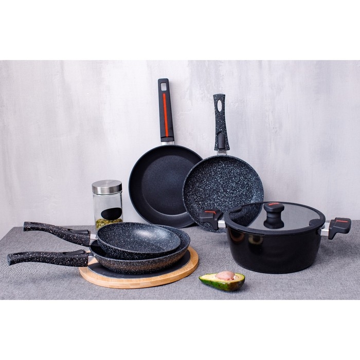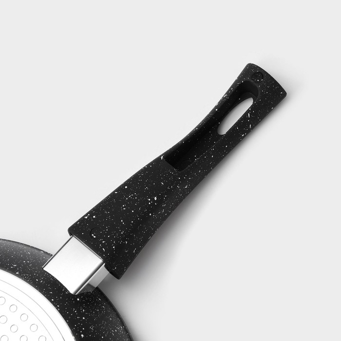 Сковорода Magistro серии Dark изготовлена из кованого алюминия, имеет прочное антипригарное покрытие с вкраплениями мраморных частиц. В такой посуде удобно жарить, тушить, она прекрасно сохраняет сочность мяса, рыбы, птицы и овощей.