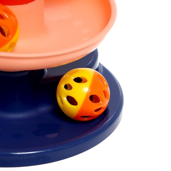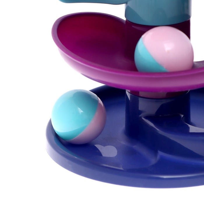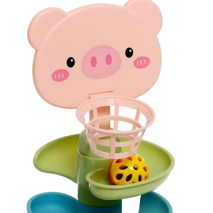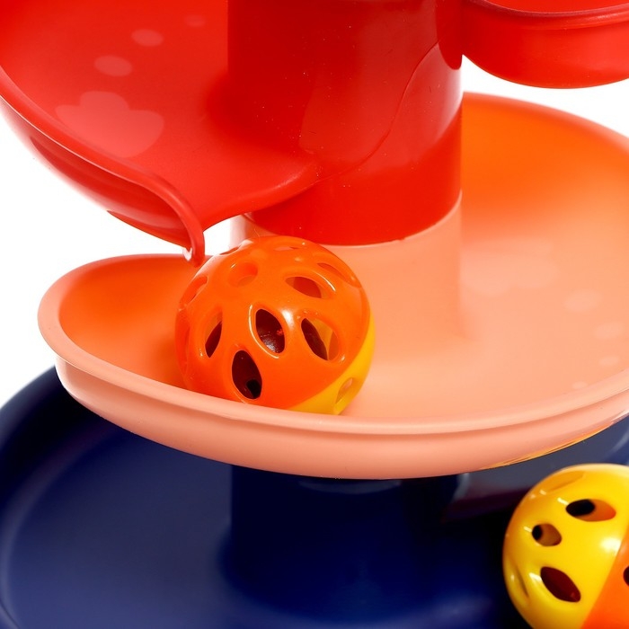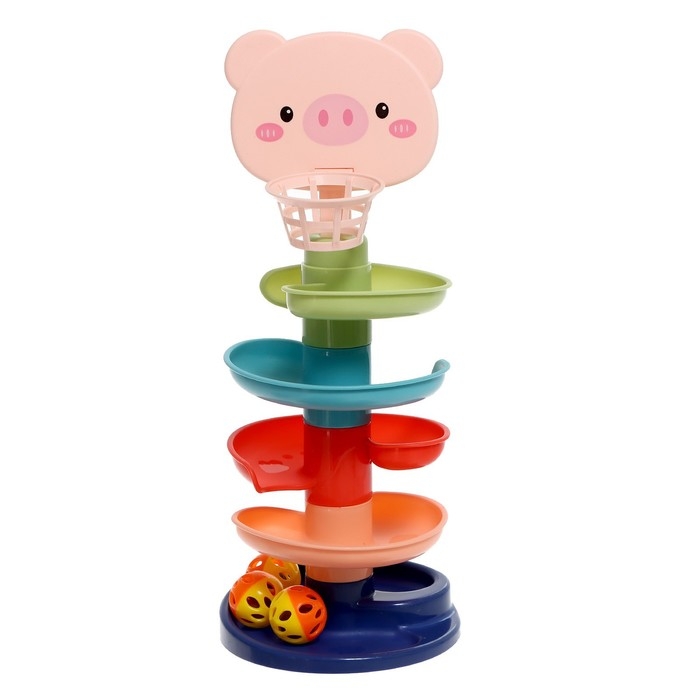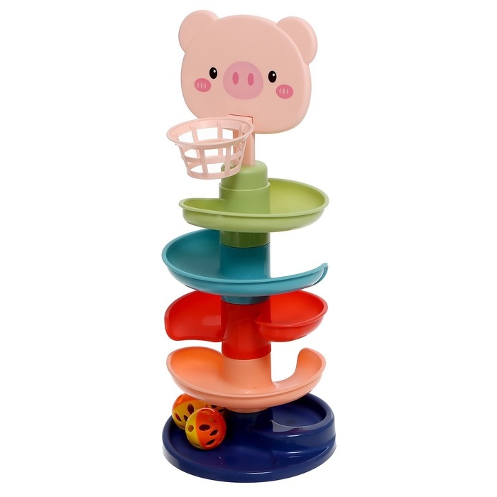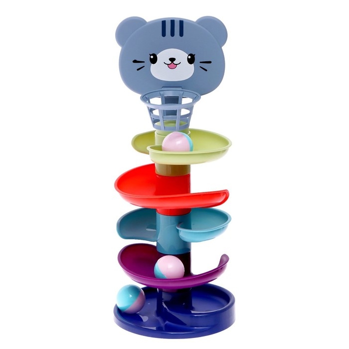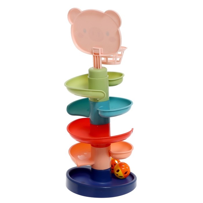 Малыш будет бросать разноцветные шарики в корзинку, и следить, как они скатываются с горки по спирали.