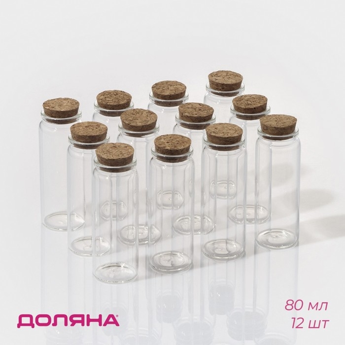 Набор стеклянных баночек для сыпучих продуктов с пробковой крышкой Доляна «Парфе. Колба», 80 мл, 3,7×10 см, 12 шт