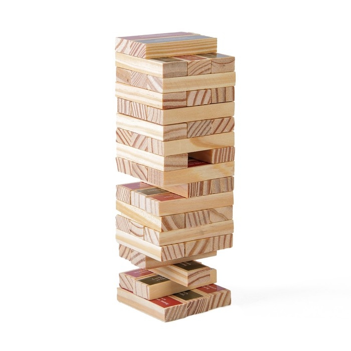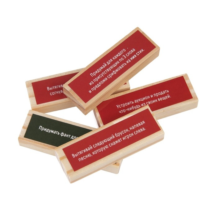 Для начала приклейте наклейки на бруски и постройте башню. По очереди вытягивайте бруски из разных частей башни так, чтобы она не рухнула, и выполняйте задания, написанные на брусках. Задания могут быть разные: некоторые из них нужно выполнить прямо сейчас, а некоторые — в свой следующий ход. Задания могут относиться только к тому, кто вытянул брусок, к нескольким участникам — или же ко всем игрокам сразу.