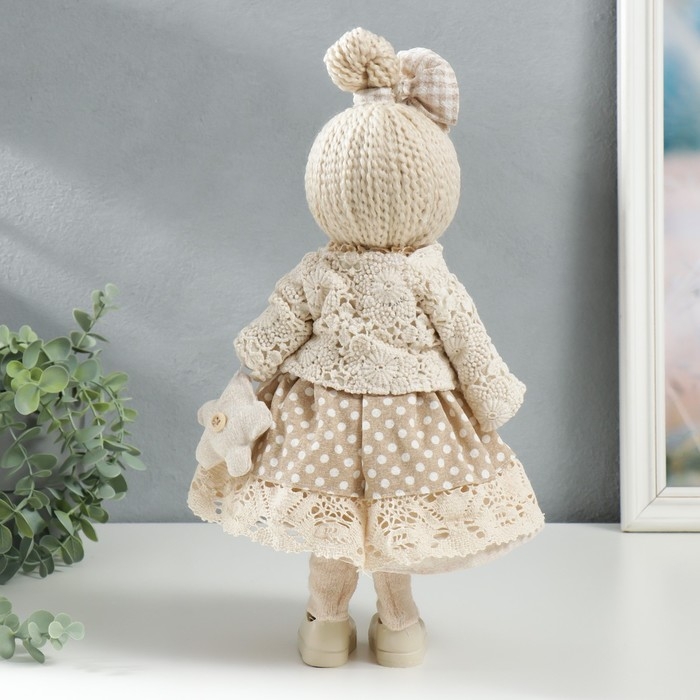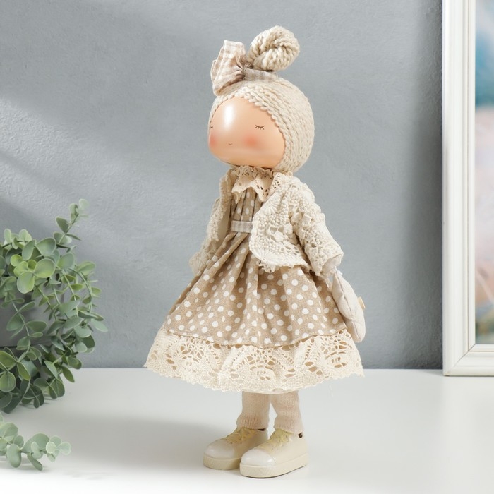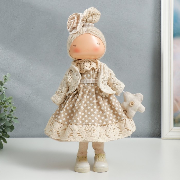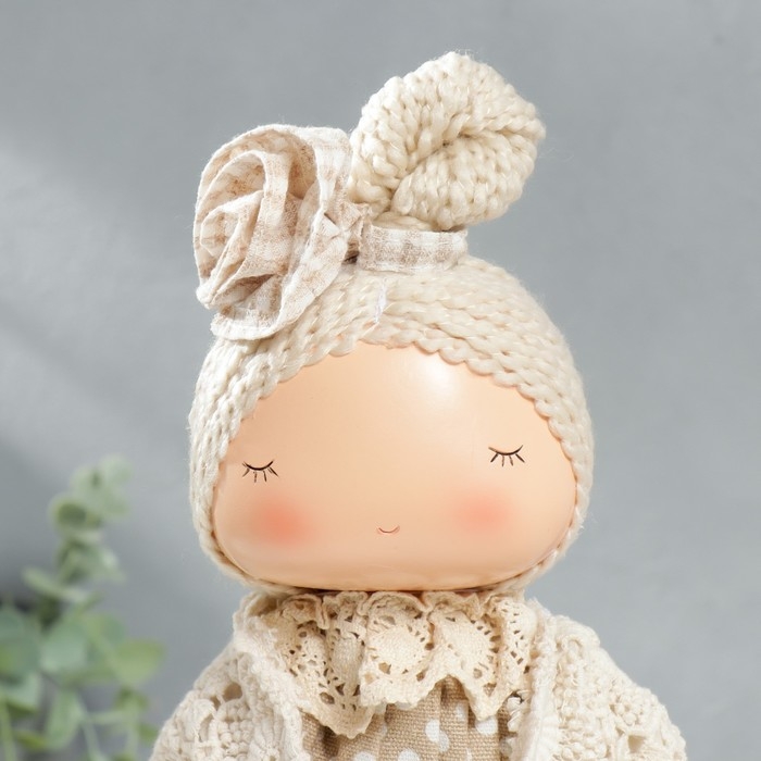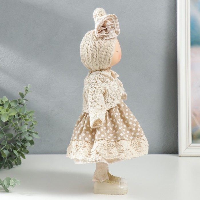 Кукла интерьерная "Малышка в бежевом платье в горох, с цветочком" 39х12,5х17 см