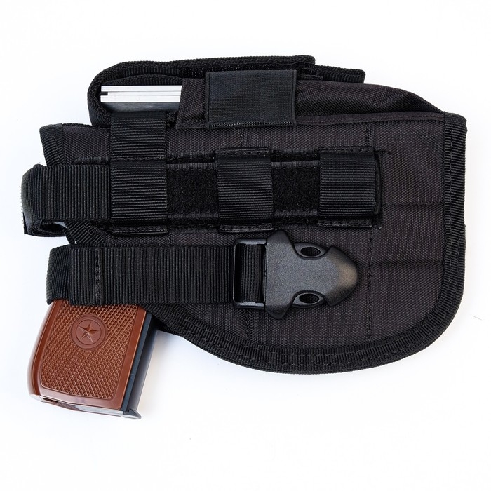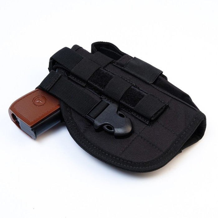 Кобура имеет регулируемый ремень, который позволяет настроить ее под любой размер пояса. Универсальная конструкция кобуры позволяет использовать ее для разных видов оружия.