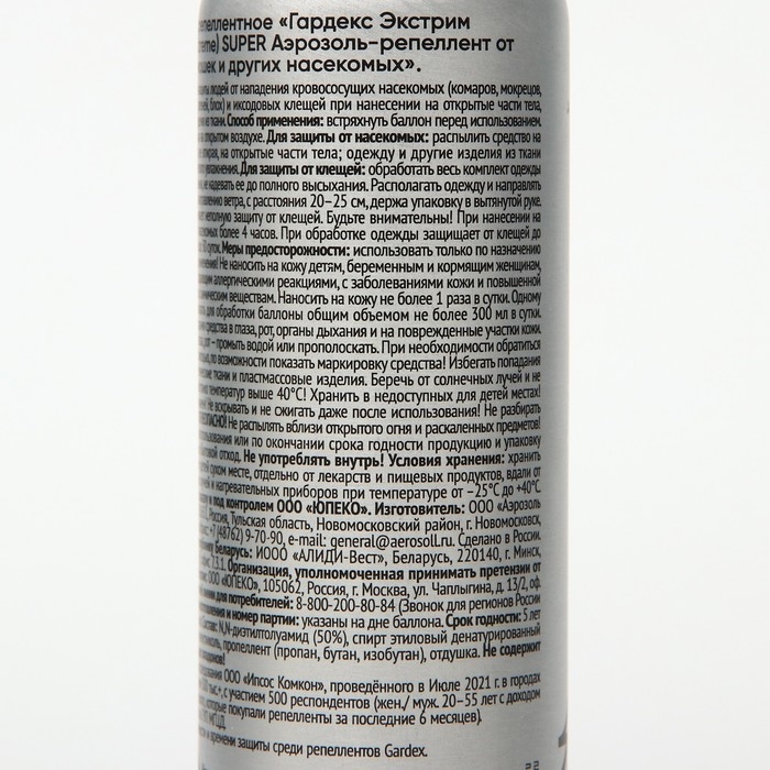 Продолжительность действия и эффективность защиты подтверждена специалистами НИИ Дезинфектологии Роспотребнадзора. Аэрозоль от комаров и других насекомых Gardex Extreme сделает Ваш отдых на природе комфортным и безопасным.