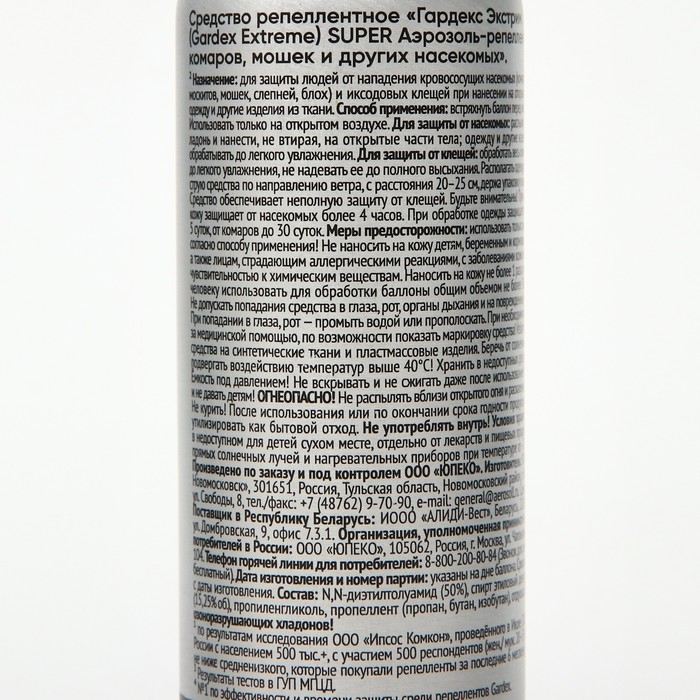 Состав: N,N-диэтилтолуамид (50%), спирт этиловый денатурированный (15,7% об.), пропиленгликоль, пропеллент (пропан, бутан, изобутан), отдушка