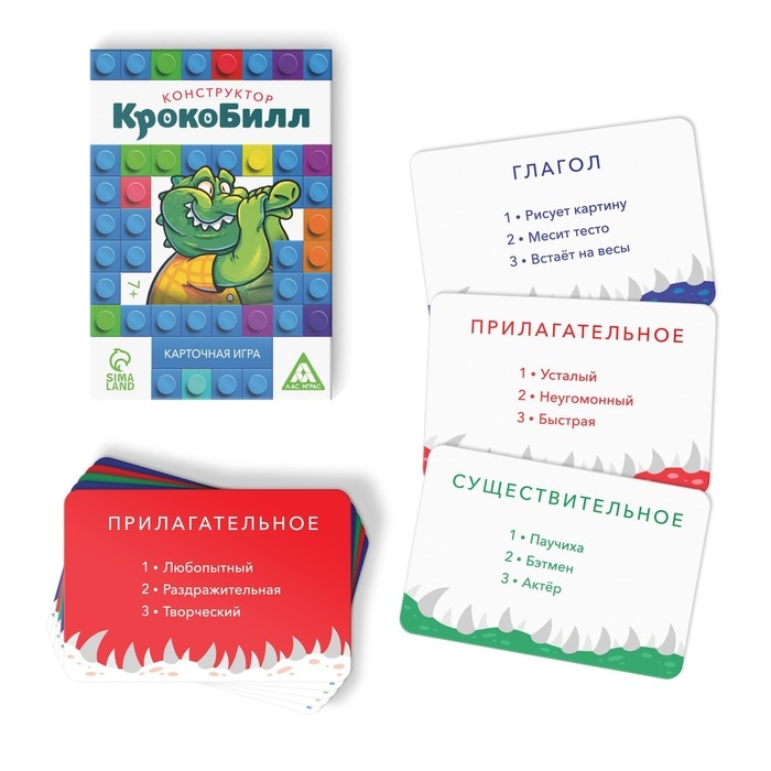 - «КрокоБилл Конструктор». На время объясняйте фразы c помощью мимики и жестов. Самое интересное: карточки — это конструктор, состоящий из трёх колод. Перемешивайте их друг с другом и получайте уникальные фразы.