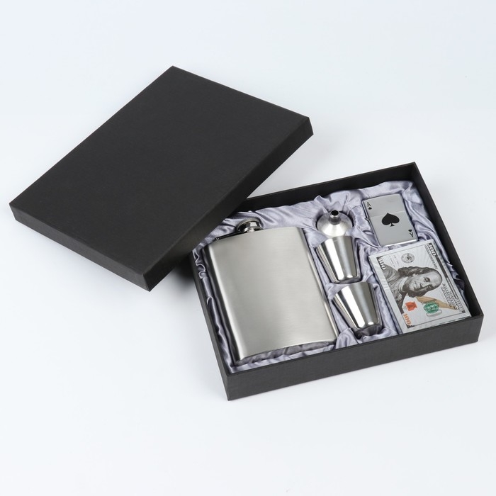 Подарочный набор 6 в1: фляжка 240 мл, рюмка 30 мл, воронка, 2.5 x 3.5 см, карты, зажигалка