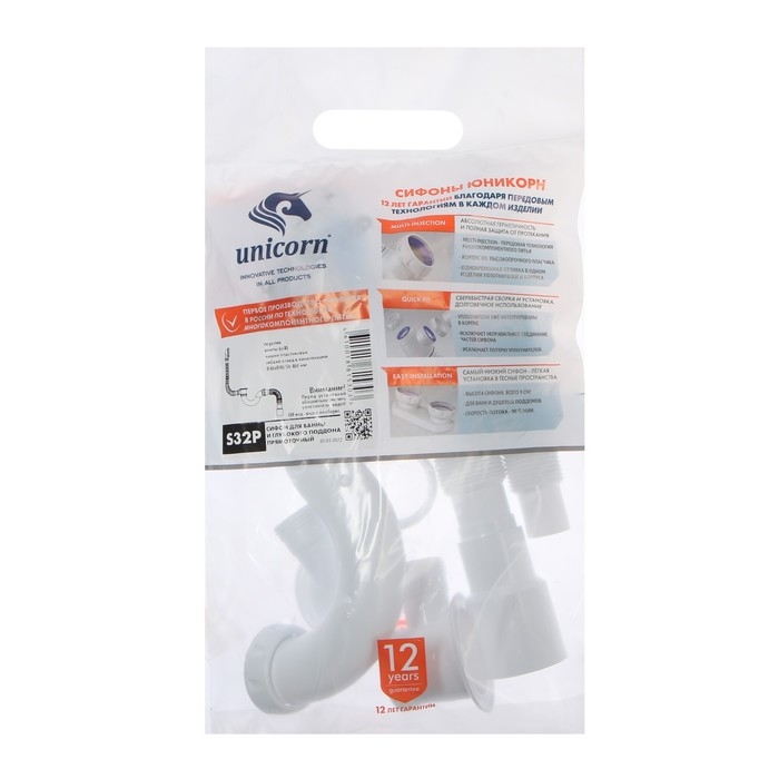 Сифон для ванны Unicorn S32P, 1 1/2"х40 мм, пластиковый выпуск и перелив, гофра 40х40/50 мм