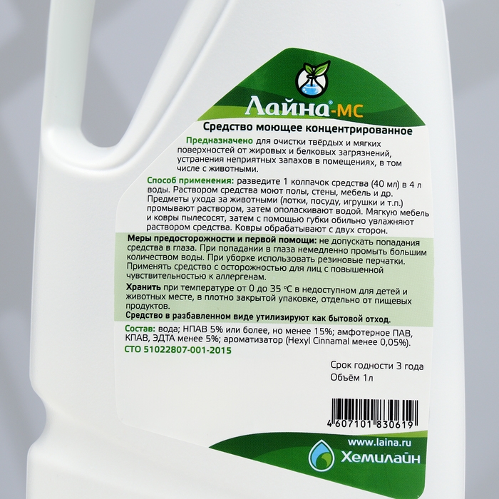 Концентрированное моющее средство Лайна-МС предназначено для уборки помещений, где обитают домашние животные. Используется для всех видов поверхностей, в том числе пола, туалета, игрушек и т.д. Отлично удаляет загрязнения и запахи. Очень экономично в использовании (1 колпачок (40 мл) на 4 л воды). Безопасно для людей и животных. Не содержит хлора, кислоты и спирта.