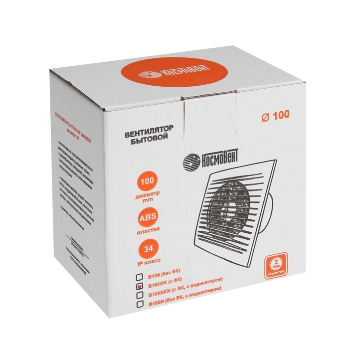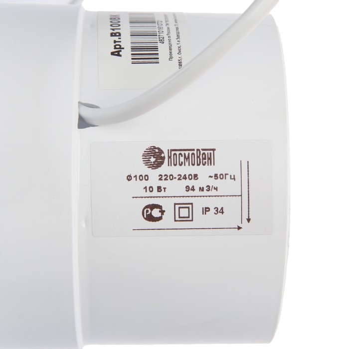 Вентилятор вытяжной "КосмоВент" В100ВК, d=100 мм, 10 Вт, 40 дБ, 105 м³/ч, с выключателем