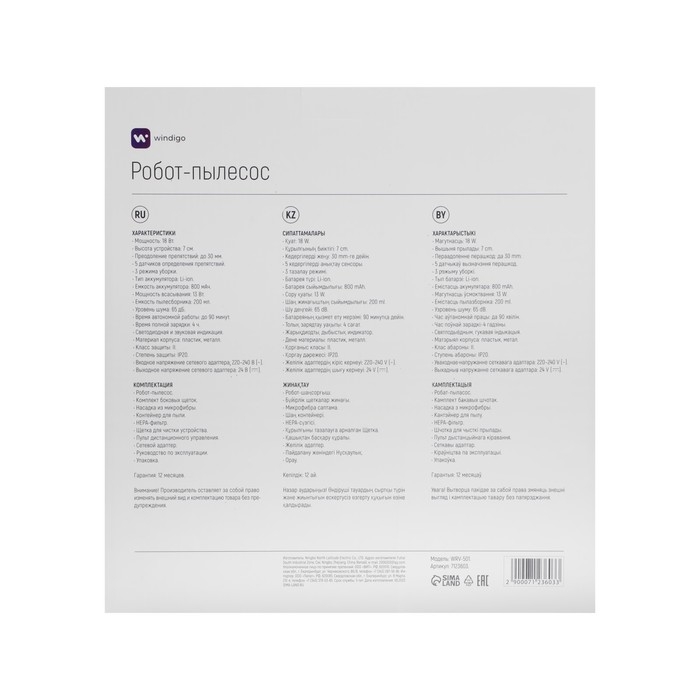 Робот-пылесос Windigo WRV-501, 18 Вт, сухая уборка, 0.2 л, белый