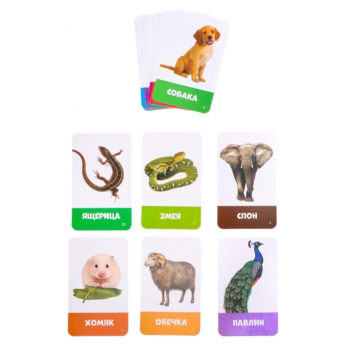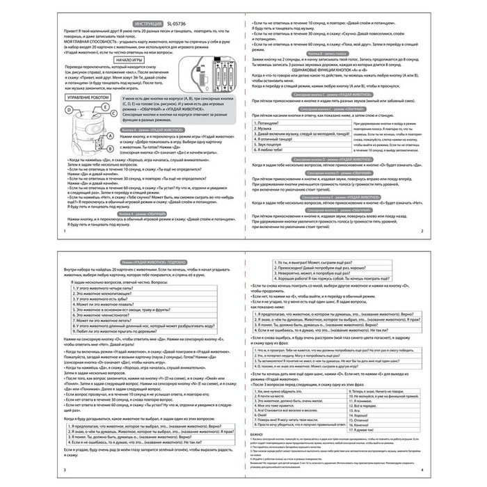 В комплект входят 20 карточек с животными. Ребёнок должен выбрать одну из них и начать отвечать на вопросы робота, нажимая сенсорные кнопки с ответами «Да» или «Нет».