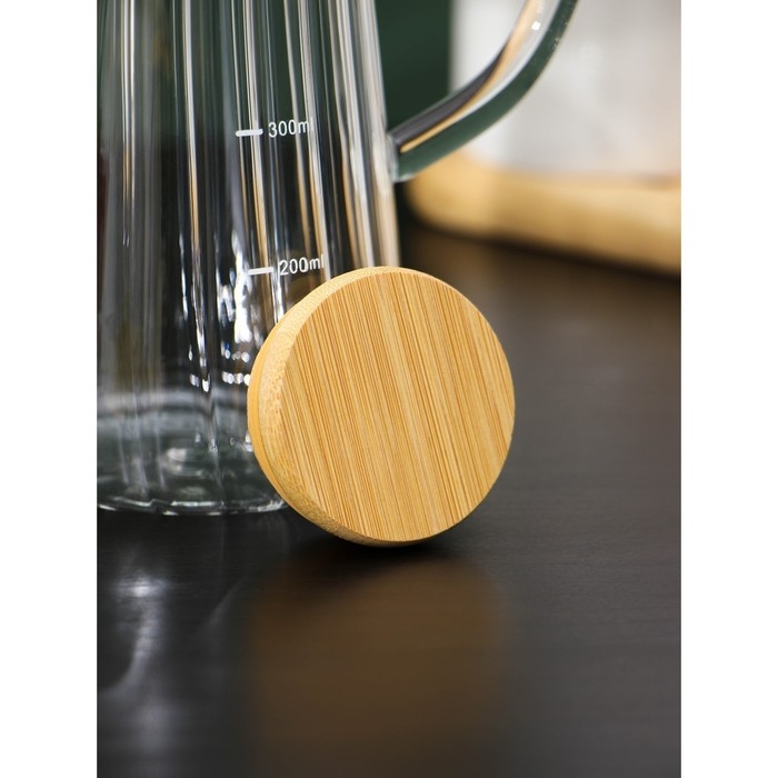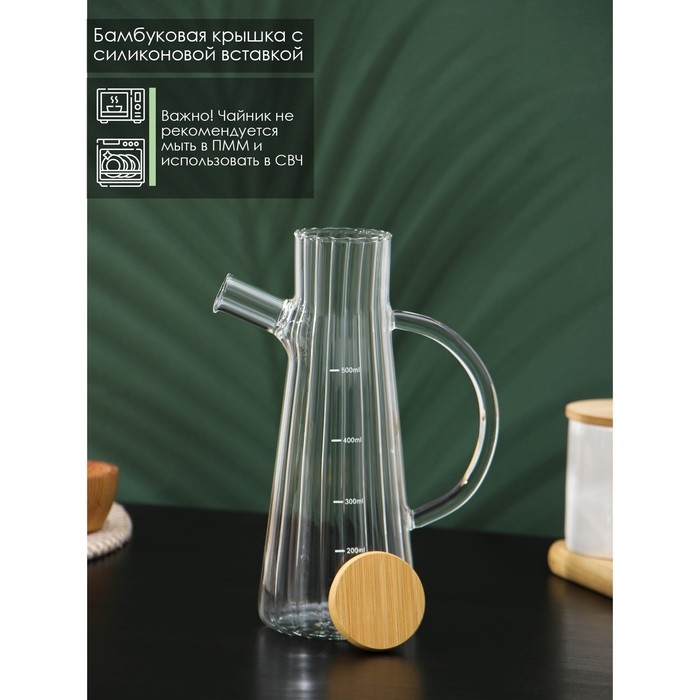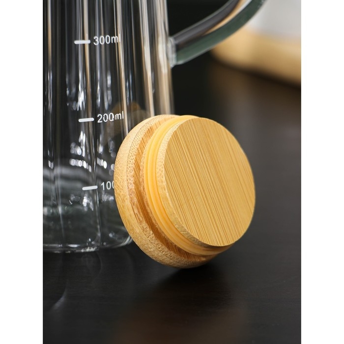 Бутыль легко моется, не впитывает запахи и не вступает в реакцию с продуктами. Бамбуковая крышка с силиконовой прослойкой плотно закрывает сосуд, защищая содержимое от пыли и предотвращая проливание жидкости.
