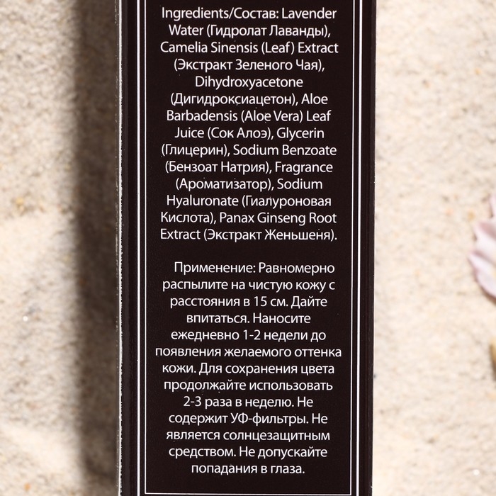 Состав: Lavender Water (Гидролат Лаванды), Camelia Sinensis (Leaf) Extract (Экстракт Зеленого Чая), Dihydroxyacetone (Дигидроксиацетон), Aloe Barbadensis (Aloe Vera) Leaf Juice (Сок Алоэ), Glycerin (Глицерин), Sodium Benzoate (Бензоат Натрия), Fragrance (Ароматизатор), Sodium Hyaluronate (Гиалуроновая Кислота), Panax Ginseng Root Extract (Экстракт Женьшеня).