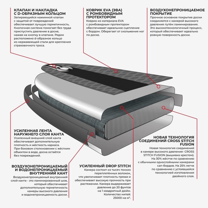 - Новая технология соединений в камере высокого давления — CROSS STITCH FUSION (вышивка крестом). На 30% жёстче по сравнению с обычными однослойными камерами сап-бордов. На 25% легче по сравнению с устоявшейся технологией изготовления двойного слоя.
